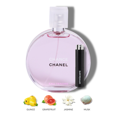 Chanel Chance Eau Tendre is a fresh fruity floral fragrance that features notes of quince, jasmine and teakwood. It is delicately fresh and sweet suited for daytime wear for any season.