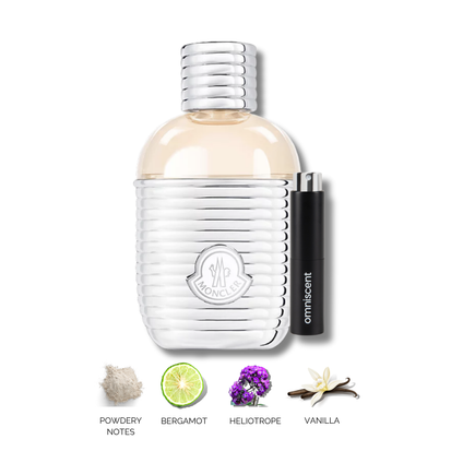 Moncler Pour Femme Eau de Parfum is a soft yet powerful floral woody fragrance inspired by crisp alpine air and timeless elegance. It opens with a bright burst of bergamot and a unique powdery snow accord, followed by a heart of delicate jasmine and heliotrope. The scent settles into a warm, creamy base of mountain woods and soft vanilla, creating a long-lasting, comforting trail. Effortlessly elegant, it’s a fragrance that feels fresh, feminine, and luxuriously modern.